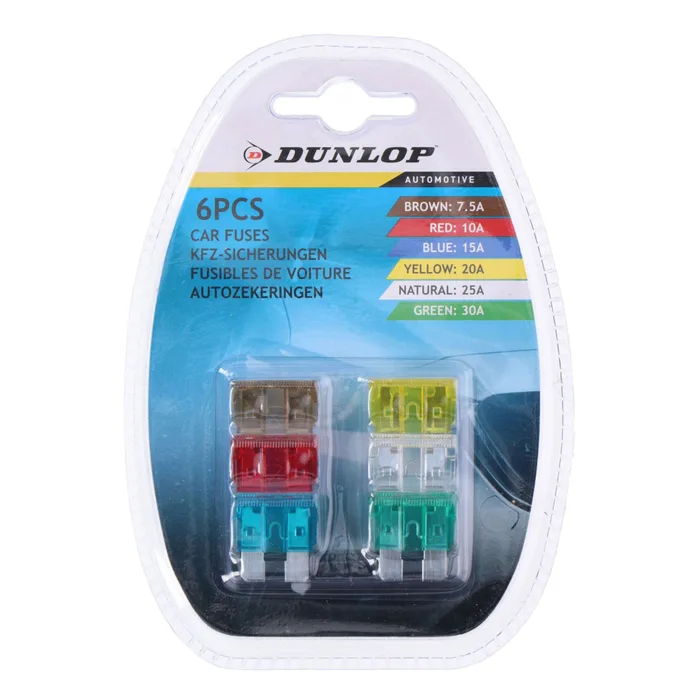 Setul Dunlop conține 6 siguranțe tip lamă de diferite valori nominale, ceea ce îl face un accesoriu indispensabil pentru șoferi.