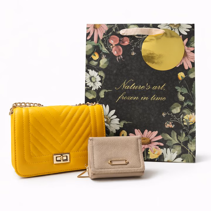 Set elegant pentru femei, ideal pentru cadou, format din geanta de umar/crossbody, portofel compact si punga cadou florala.