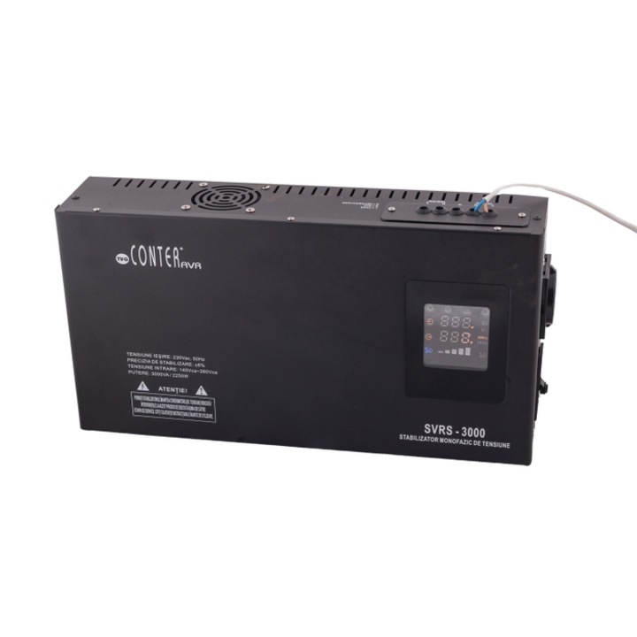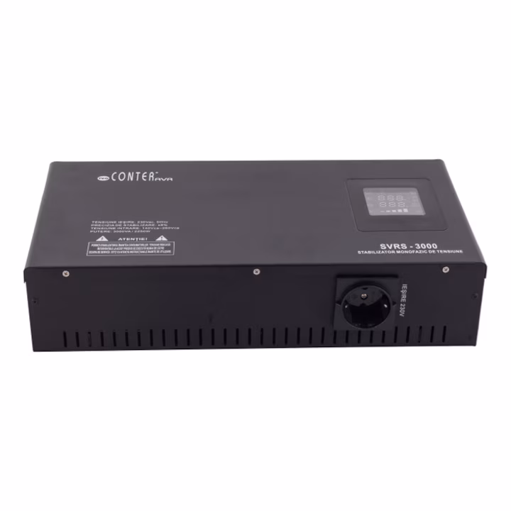 Stabilizatorul de tensiune cu releu, slim SVRD-3000, 3000VA / 2250 W este un dispozitiv electric care mentine valori relativ constante ale tensiunii electrice pe un element de circuit. Stabilizatorul de tensiune este cunoscut si dupa denumirea de regulator de tensiune.
